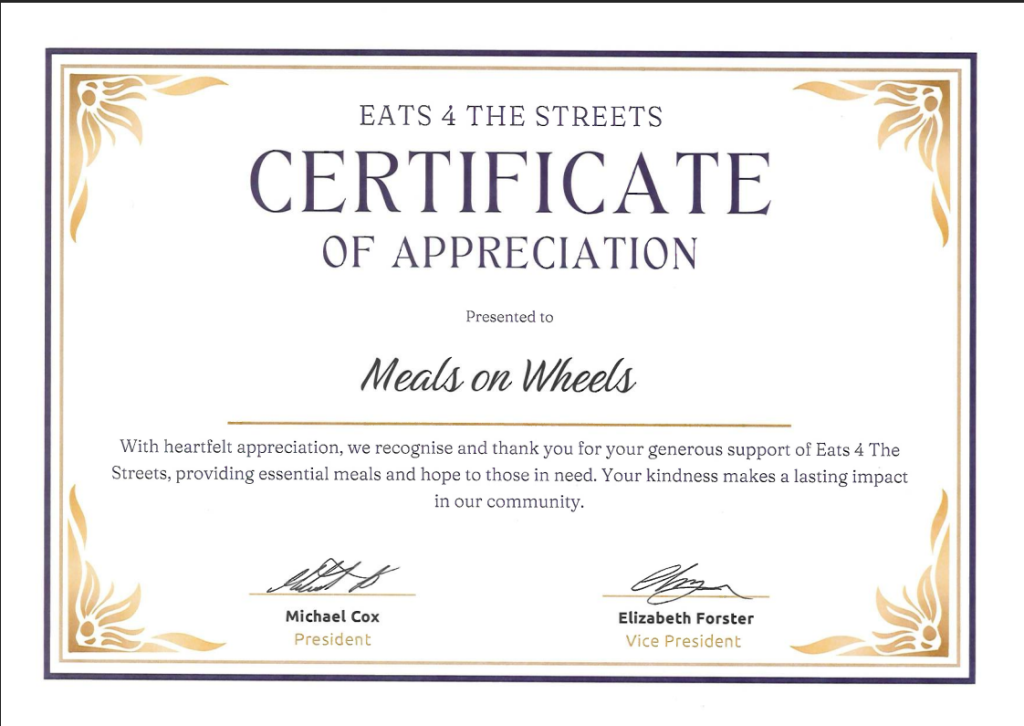 Eats 4 The Streets recently awarded Meals on Wheels with a certificate of appreciation in their efforts to support their lasting impact on the local community which aligns very closely with the Mission of Meals on Wheels. Providing essential meals and hope to those in need, to ensure that no one goes hungry.