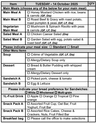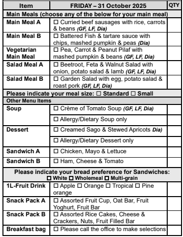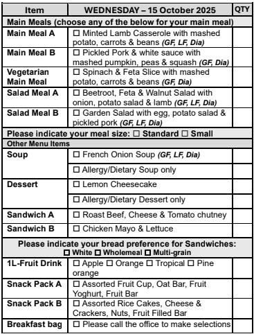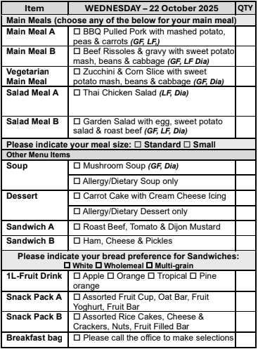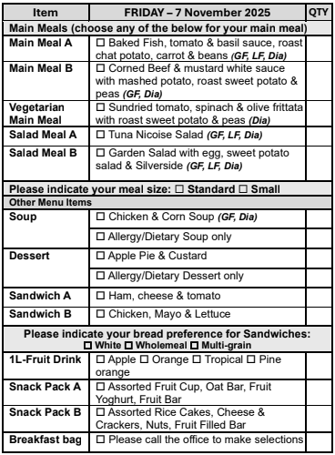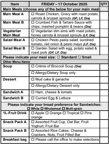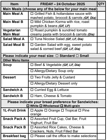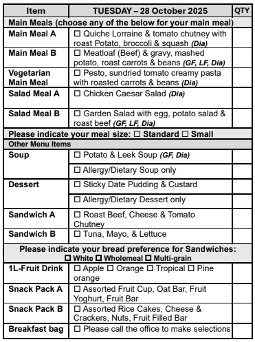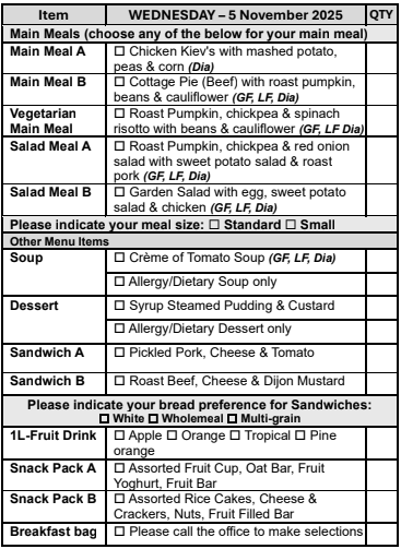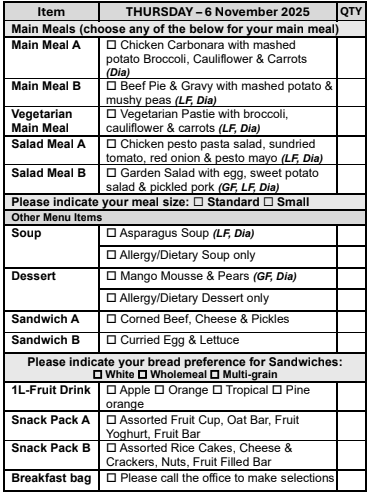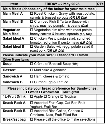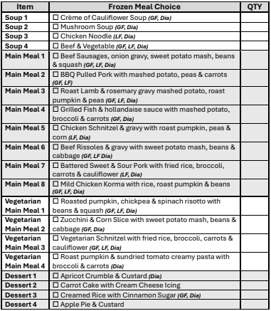 If you prefer not to select from our Choice Menu or miss the order form deadline, don’t worry! You’ll automatically receive Meal A, on your pre-selected days, ensuring you never miss out on a delicious meal.
