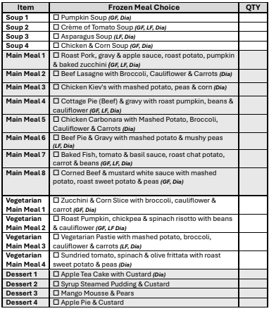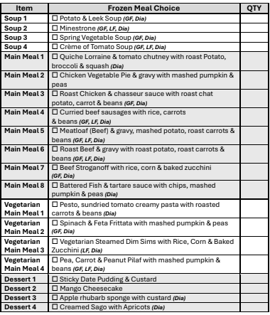 Please look out for the symbols next to each meal such as GF = Gluten-free, LF= Lactose free, Dia = Diabetic