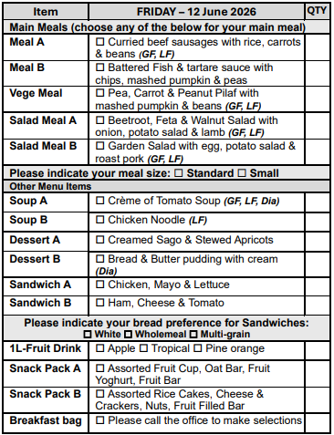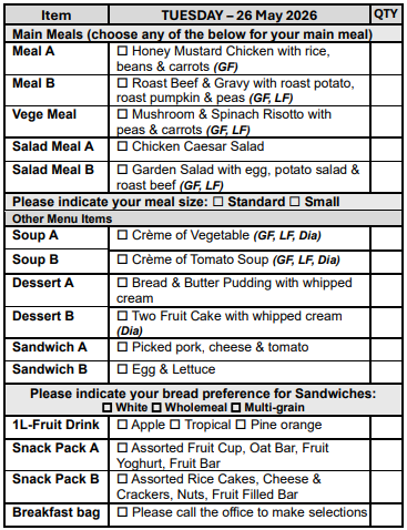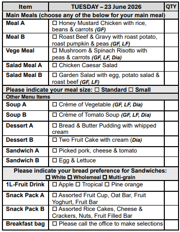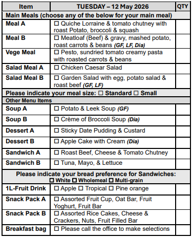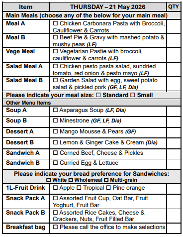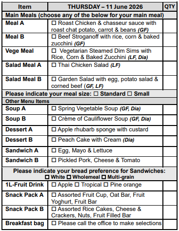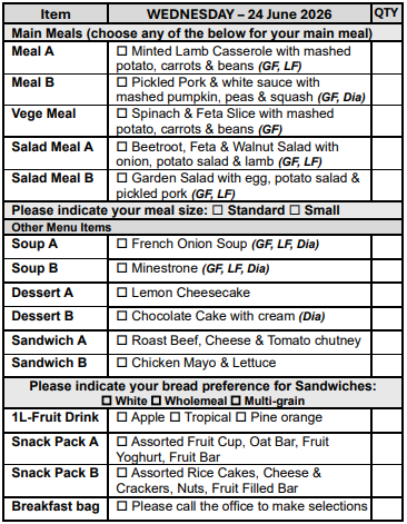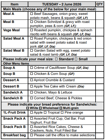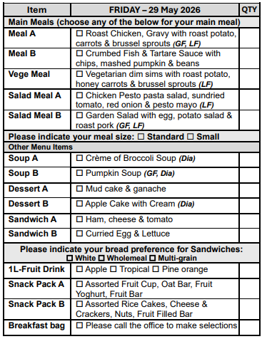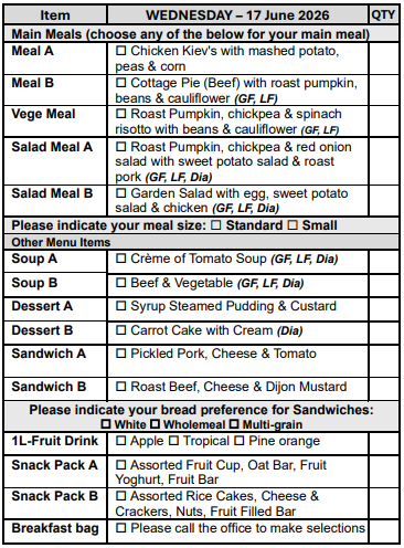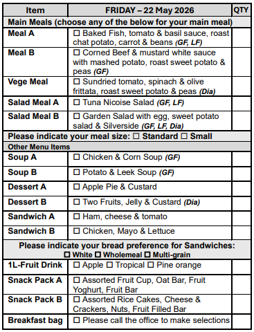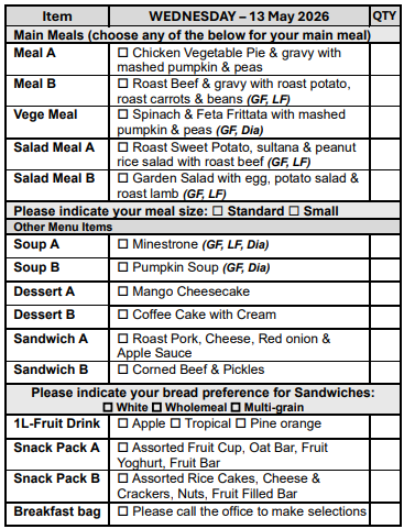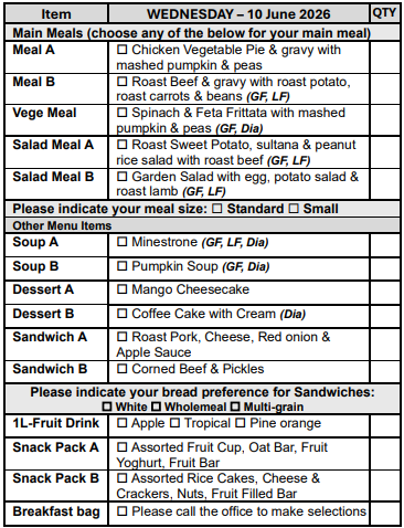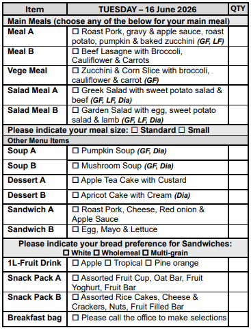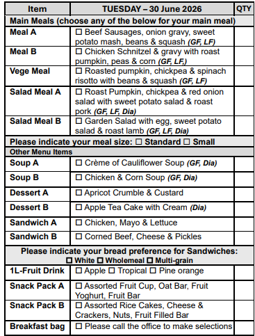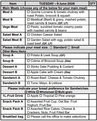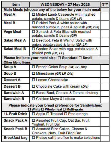 If you prefer not to select from our Choice Menu or miss the order form deadline, don’t worry! You’ll automatically receive Meal A, on your pre-selected days, ensuring you never miss out on a delicious meal.